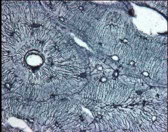 The small dark circles in the human bone at center are cross sections of Haversian canals. The crossed polarizers give rise to the dark color in the empty canals. The large circles are cross sections of osteons, which are large fibers about 200 microns across. Bovine plexiform bone has a laminated structure. Colors in the polarized light images arise from the fibrous structure of bone; the anisotropy gives rise to a wavelength dependent rotation of the polarization of the light.