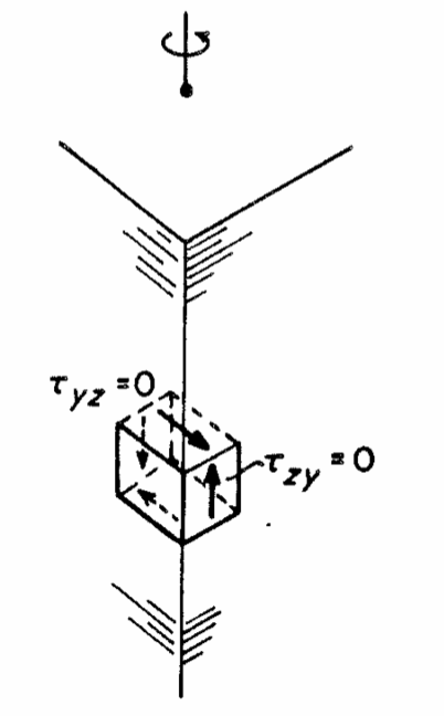 Consider a differential element at the corner of the bar. The surface traction upon the lateral surface is zero for torsional loading of the bar. By virtue of the symmetry of the stress tensor, the complementary shear stress must be zero. Since all components of the shear stress vanish at the corner, the shear strain must also vanish. By such arguments one can show that the cross sections of a rectangular bar in torsion must undergo warp: see, e.g. F.P. Beer and E.R. Johnston, Jr., Mechanics of Materials, McGraw Hill, New York, 1981. Consider, however, a similar micro-element in a material with a lattice type structure. The struts in the lattice can support a moment as well as a force, as shown in this diagram. The moment must be nonzero since the transverse struts undergo a twist. For the micro-element to be in equilibrium, a nonzero shear force must be transmitted through the longitudinal struts.