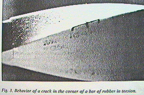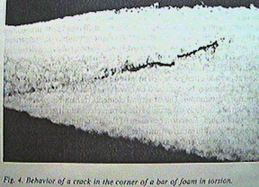 The corner elements of an elastic material and a lattice structure, then, are predicted to behave quite differently. To illustrate this difference, make a small nick in the corner of the rubber bar and a similar nick in the corner of the foam bar. When the rubber bar is twisted, the crack is not expected to open in mode III (in which the faces of the crack shear parallel to each other and parallel to the crack front) since there is no stress in the region of the crack. While this is strictly true only for an infinitesimal crack, the crack opening is negligibly small if the crack is sufficiently short compared with the bar width, as shown in as shown in figure 3. The situation is different in the foam bar shown in figure 4. The corner crack opens noticeably in mode III when the bar is twisted. Here the corner of the bar has been made more visible by gluing black thread to it with rubber cement. A line can also be drawn with ink as was done with the rubber bar, but the line tends to be rather broad, due to the structure of the foam. The continuum view is shown in figure 5