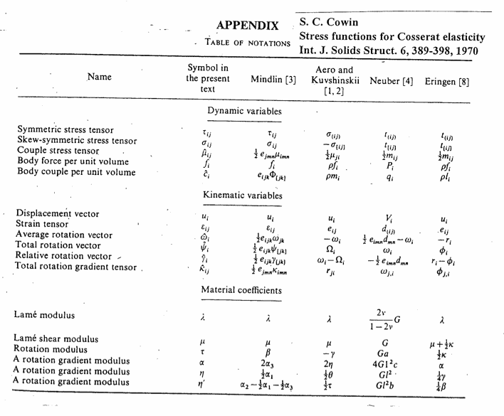 Cosserat equations using symbols after Eringen. Click on image for larger image. Here is a table of symbols used by different authors.