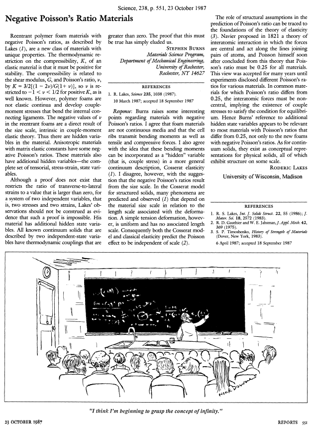 Lakes, R. S., "Negative Poisson's ratio materials", Science, 238 551 (1987).