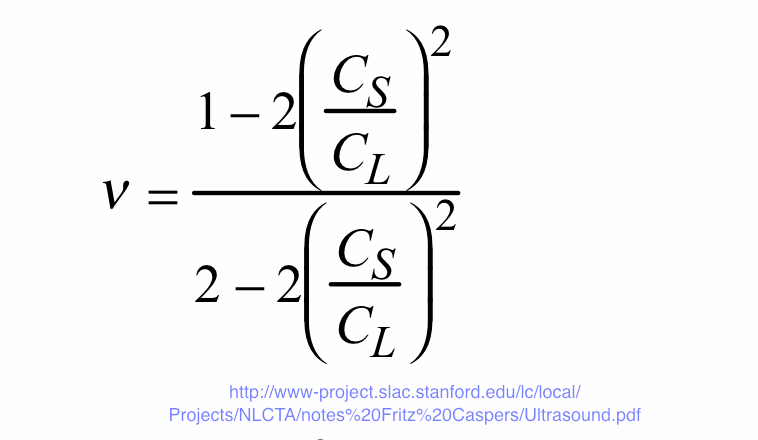 Poisson's ratio from wave speeds "c"; subscript L means longitudinal; subscript S means shear,