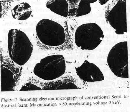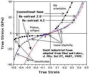 Foams with negative Poisson's ratios were produced from conventional low density open-cell polymer foams by causing the ribs of each cell to permanently protrude inward, resulting in a re-entrant structure. Specimens of conventional foam were compressed triaxially, i.e. in three orthogonal directions, and were placed in a mold. The mold was heated to a temperature slightly above the softening temperature of the foam material. Stress strain curves and curves of nonlinear behavior are given below. These foams are essentially isotropic; they do not depend on anisotropy to achieve the effects observed. Applications of novel, re-entrant foams with negative Poisson's ratios may be envisaged in view of the above. An example of the practical application of a particular value of Poisson's ratio is the cork of a wine bottle. The cork must be easily inserted and removed, yet it also must withstand the pressure from within the bottle. Rubber, with a Poisson's ratio of 0.5, could not be used for this purpose because it would expand when compressed into the neck of the bottle and would jam. Cork, by contrast, with a Poisson's ratio of nearly zero, is ideal in this application. It is anticipated that re-entrant foams may be used in such applications as sponges, robust shock absorbing material, air filters, biomaterials and fasteners.
