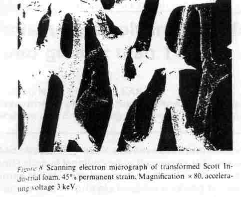 Brandel, B. and Lakes, R. S., "Negative Poisson's ratio polyethylene foams", J. Materials Science, 36, 5885-5893, July (2001). Various polyethylene foams were subjected to thermo-mechanical processing with the aim of transforming them into re-entrant materials exhibiting negative Poisson's ratio. Following transformation, large cell foams (cell sizes of 1 and 2 mm) exhibited re-entrant cell structure and negative Poisson's ratio over a range of processing times and temperatures. Poisson's ratio vs. strain for these foams was similar to prior results for reticulated polyurethane foams. Following processing, microcellular polyethylene foam was densified but cells remained convex; it did not exhibit a substantial negative Poisson's ratio. This foam had a different transition temperature as determined via DSC than the large cell foams.