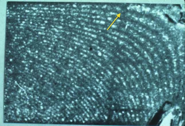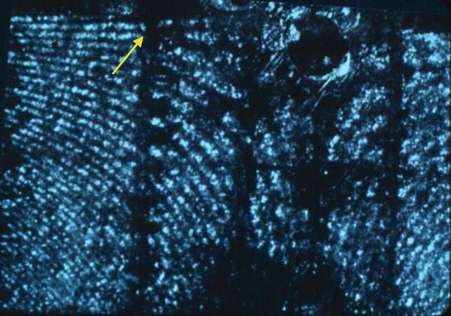 Ligament structure. Bifurcation/Fusion of collagen fibrils in normal MCL tissue at 20,000X (arrow). Note the collagen fibril overlap and interweaving.